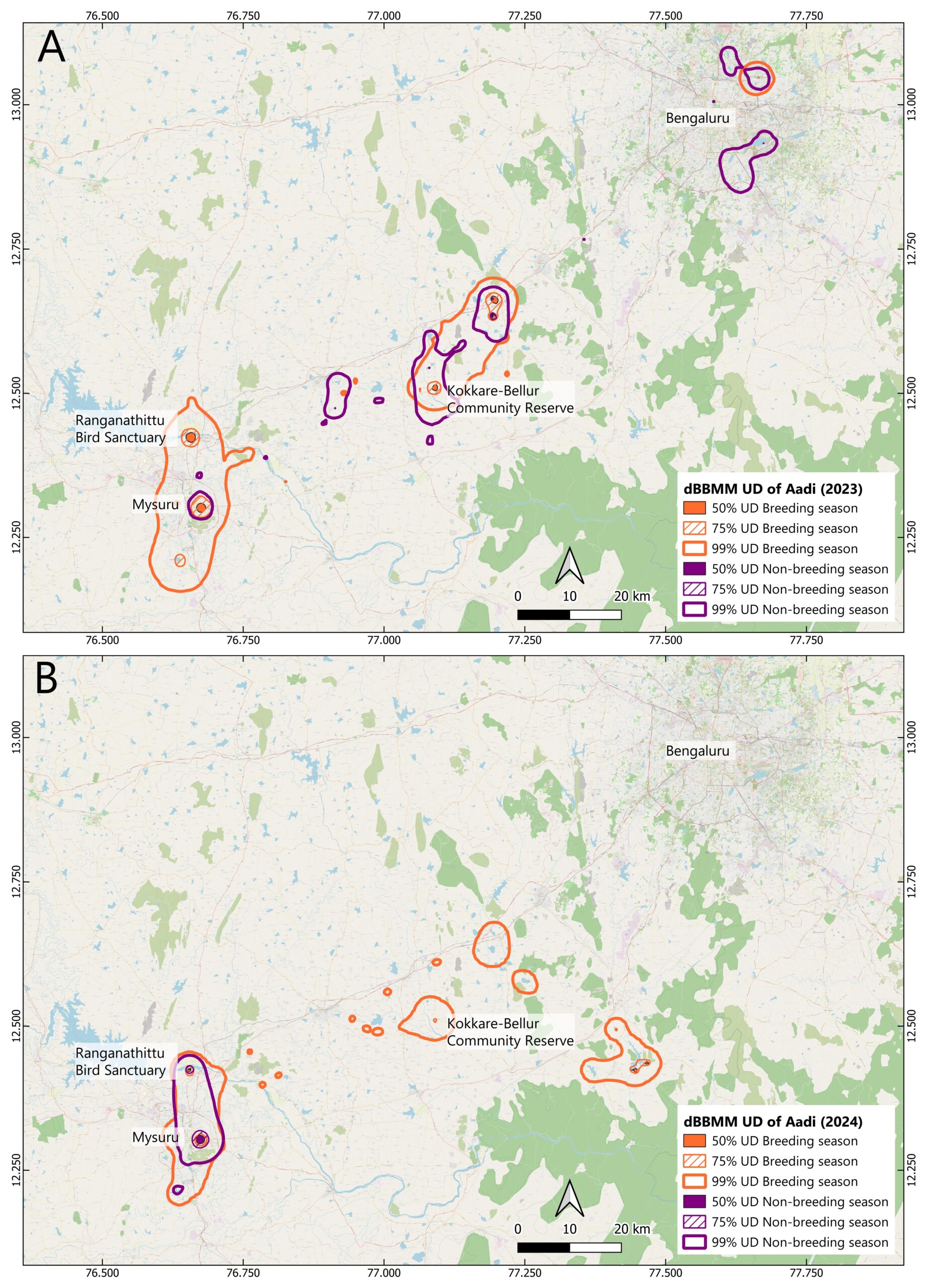 During the first non-breeding season (February to September 2023), Aadi’s movements were broadly distributed across the Bengaluru–Mysuru belt. A few concentrated 50% core areas were evident (less than 1 km²), indicating spatially diffuse foraging patterns. The 75% UD encompassed 1 km², centered on Kudlur Lake in a neighboring district, while the 99% UD extended to 907 km², incorporating multiple urban lakes in both the Bengaluru and Mysuru regions. In the second non-breeding season (May to September 2024), ranging patterns contracted substantially. The 50% core area was recorded to be 2 km², concentrated within a 10 km radius of Ranganathittu Bird Sanctuary in Mysuru and Karanji Lake. The 75% UD reduced to 1 km² (no change in absolute area but representing refined spatial concentration), and the 99% UD contracted to 152 km², showing an 83% reduction compared to the first non-breeding season (Figure 2).
