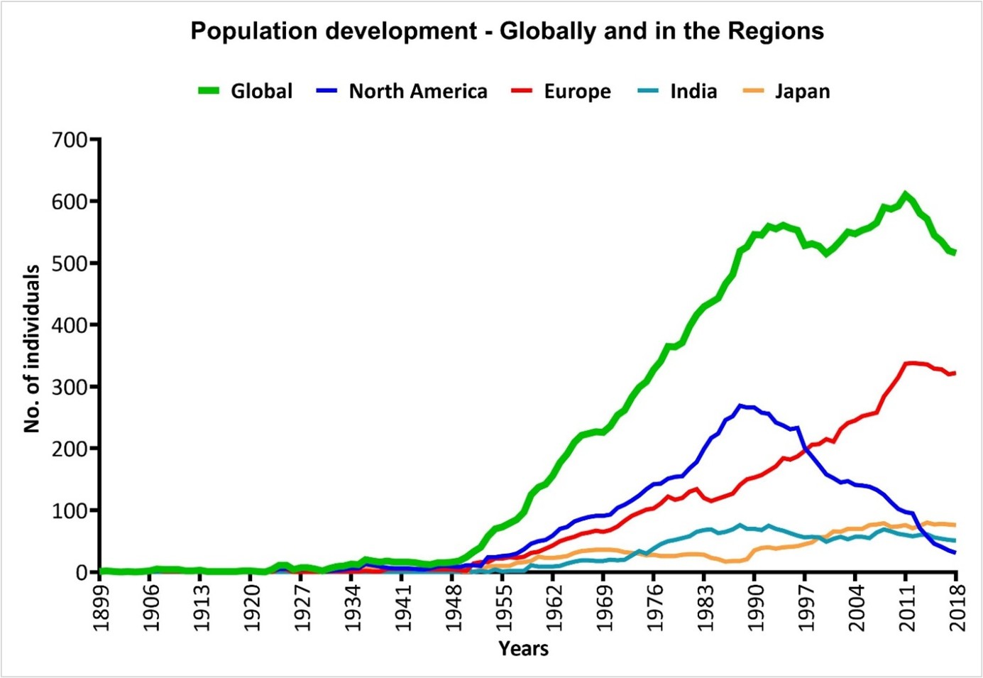 The historical trend of the global captive population of lion-tailed macaque can be roughly divided in four periods (Figure 1). Between the end of the 19th century and about 1950, the number of individuals and births was small. Both increased slightly until the 1970s, followed by a significant increase till the 1990s, with the highest number of individuals (n = 561) recorded in 1994. From this “prime-time” onwards, the size of the population decreased. No further increase was due to a strong management-induced shrinking of the American subpopulation (see Lindburg, 2001) – “compensated” by an increase in the European subpopulation, which played a dominant role since the mid-1990s. The global population has been declining since 2011–2012, mainly due to management measures implemented in Europe (see Sliwa et al., 2016). Among the smaller subpopulations, the Japanese population remained stable, while the size in India is shrinking (see later). As of 2018, Europe constituted 62% of the global population, followed by Japan and India, which comprise 15% and 10% of the population, respectively. The North American population has been reduced to a small, ageing population of 31 individuals.