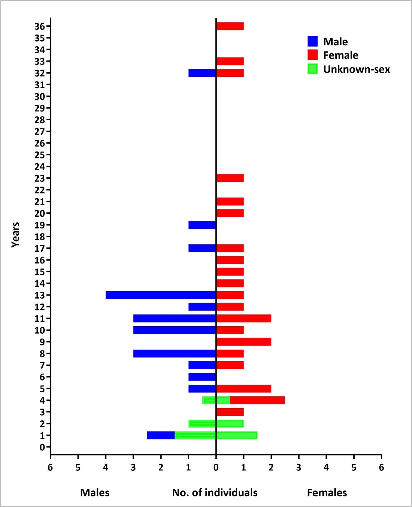 The age sex structure of the Indian population, as of 2018 refers to 51 individuals, including five individuals for whom birth date estimates were not known, but transfer dates to zoos were available (Figure 11). Based on these dates, the mean (±SD) ages of the individuals were as follows: females 14.65±9.2 years, males 11.8±6.12 years, unknown-sex 2.36±1.25 years.