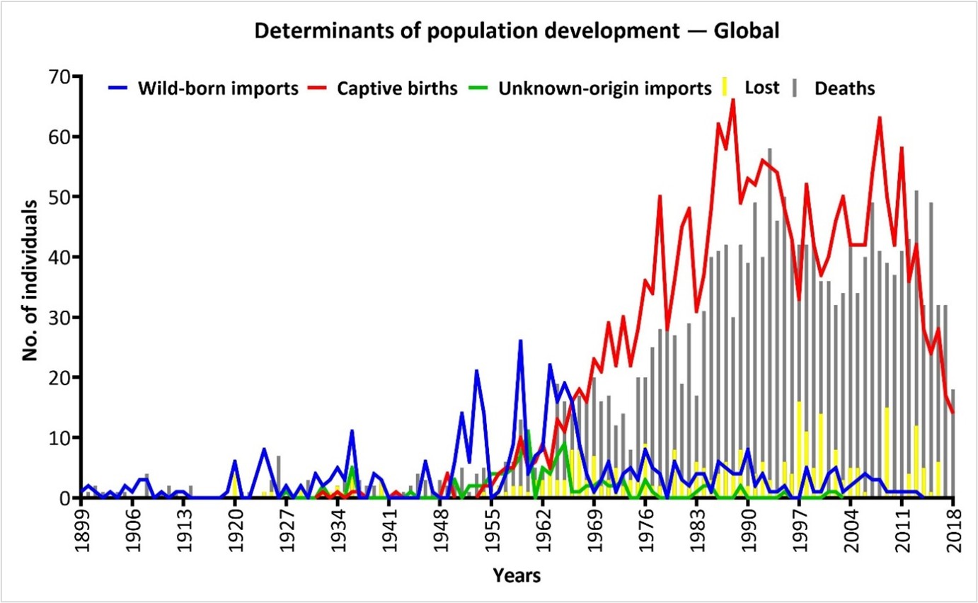 From the 1970s onwards, further import of wild-caught individuals was voluntarily banned in zoos in North America and Europe, more breeding was propagated, and the proportion of individuals born into the population increased substantially (see Hill, 1971; Heltne, 1985; Kaumanns & Rohrhuber, 1995). Over the 119-year period (1899–2018), 2,195 births, 1,923 deaths, and 295 individuals lost to follow-up were recorded. North America (691 births) and Europe (1,044 births) together contributed to 79% of the individuals born in zoos globally. The number of births increased till about 1989, which was followed by a decrease due to management-induced population control in North America. The second increase in births in the global population from the early 2000s was contributed by increased breeding in Europe. Over the last decade, the number of births has been declining continuously as a result of birth control measures in Europe and declining birth rates in other subpopulations.