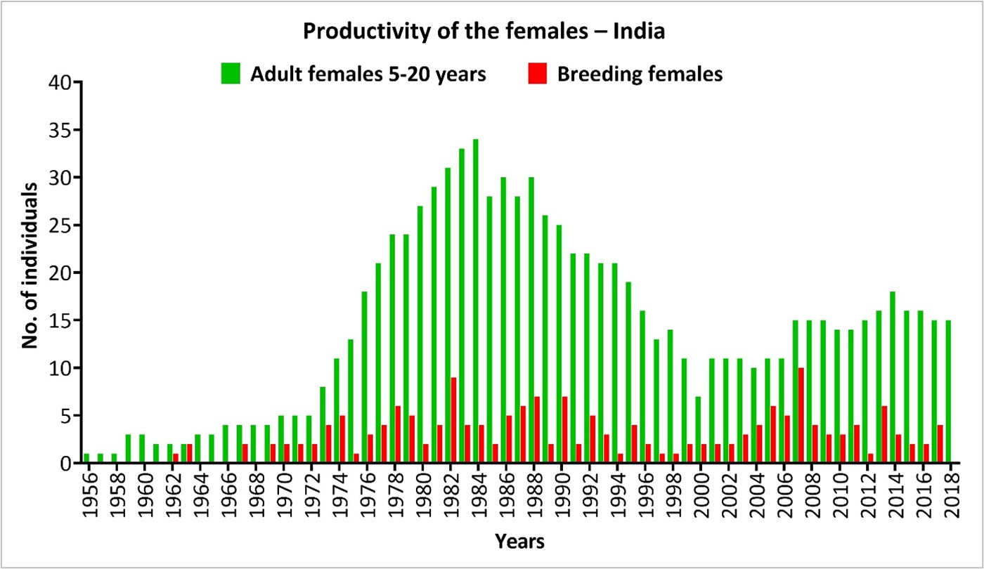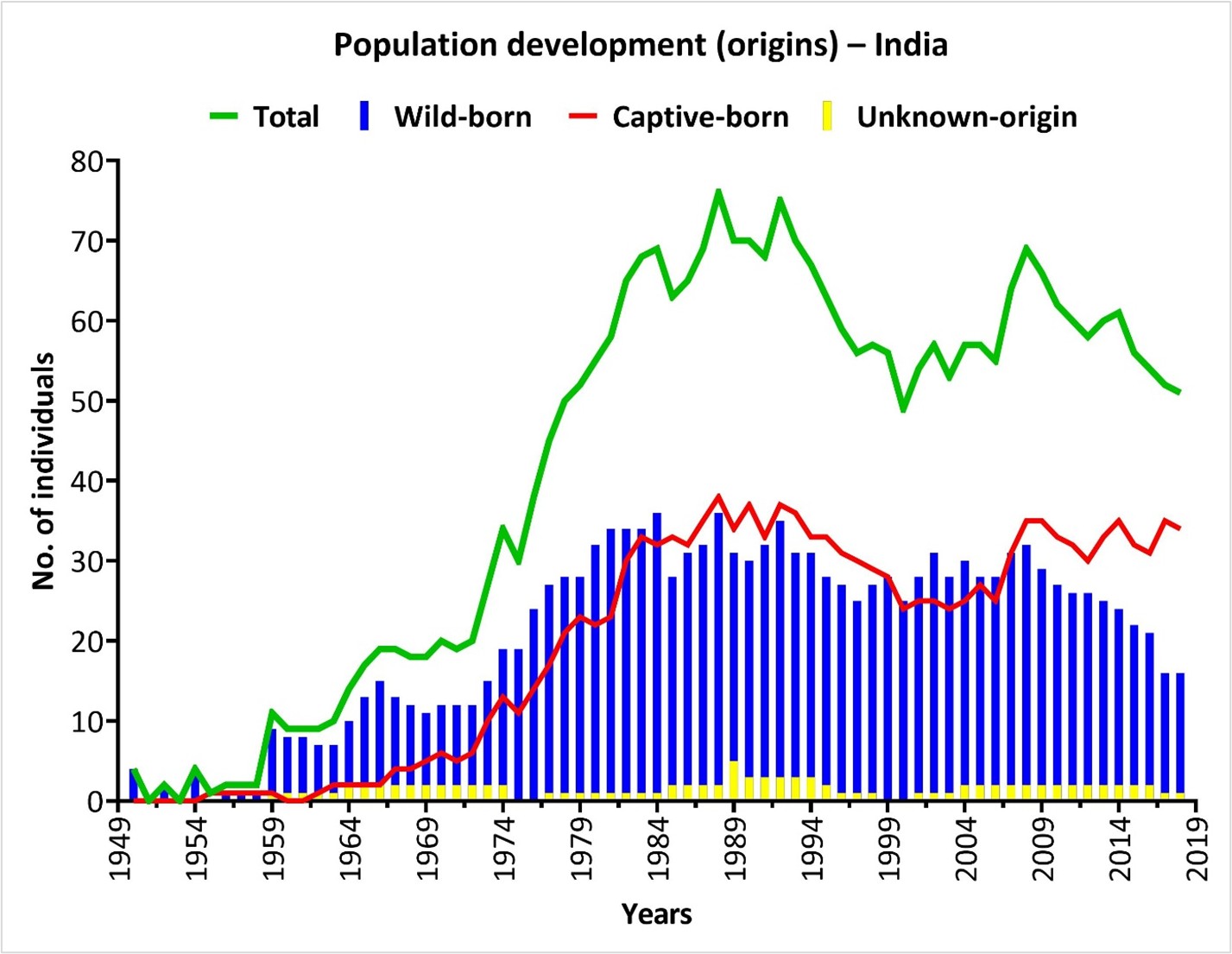 The present study indicates very poor reproductive output of the Indian population, and related to this is a likely loss of genetic and phenotypic diversity. Therefore, the Indian captive population so far cannot be considered as a potential reserve. This is supported by the poor age-sex composition of the current population, especially due to the old age of the wild-born individuals. Furthermore, many females experience long periods of non-breeding. Living conditions that do not allow reproduction for extended time periods might negatively impact the future reproductive potential of individuals (see Penfold et al., 2014).
