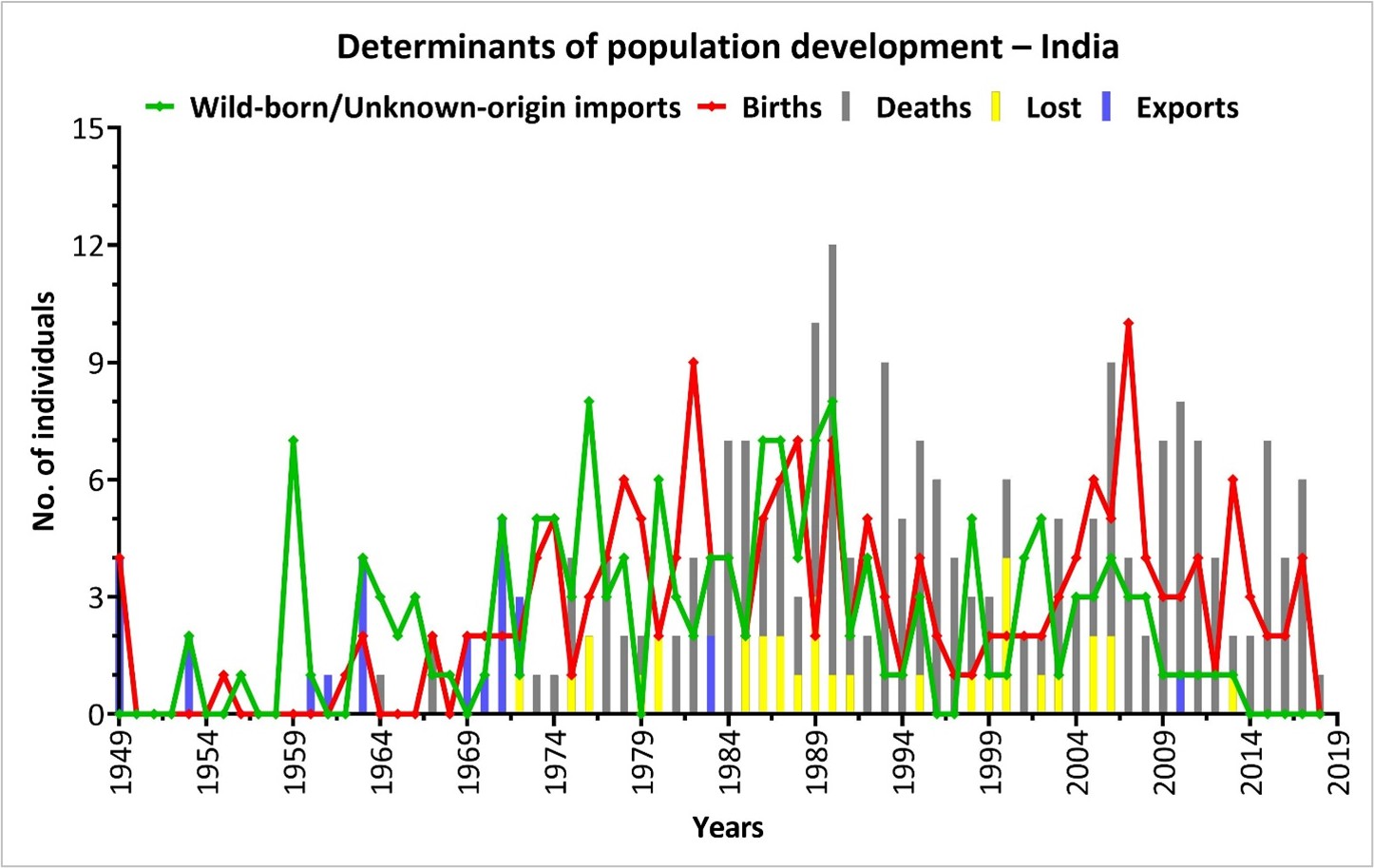 The development of the Indian population was influenced by the integration of wild-caught and unknown origin individuals (n = 165), captive births (n = 185), and a few transfers (n = 28) to other regions (see Table 3, Figure 4). A total of 213 deaths and 33 individuals lost to follow-up were recorded. Births, as recorded continuously from 1969 onwards, increased until 1982, declined till 1998, increased again till 2007, and have