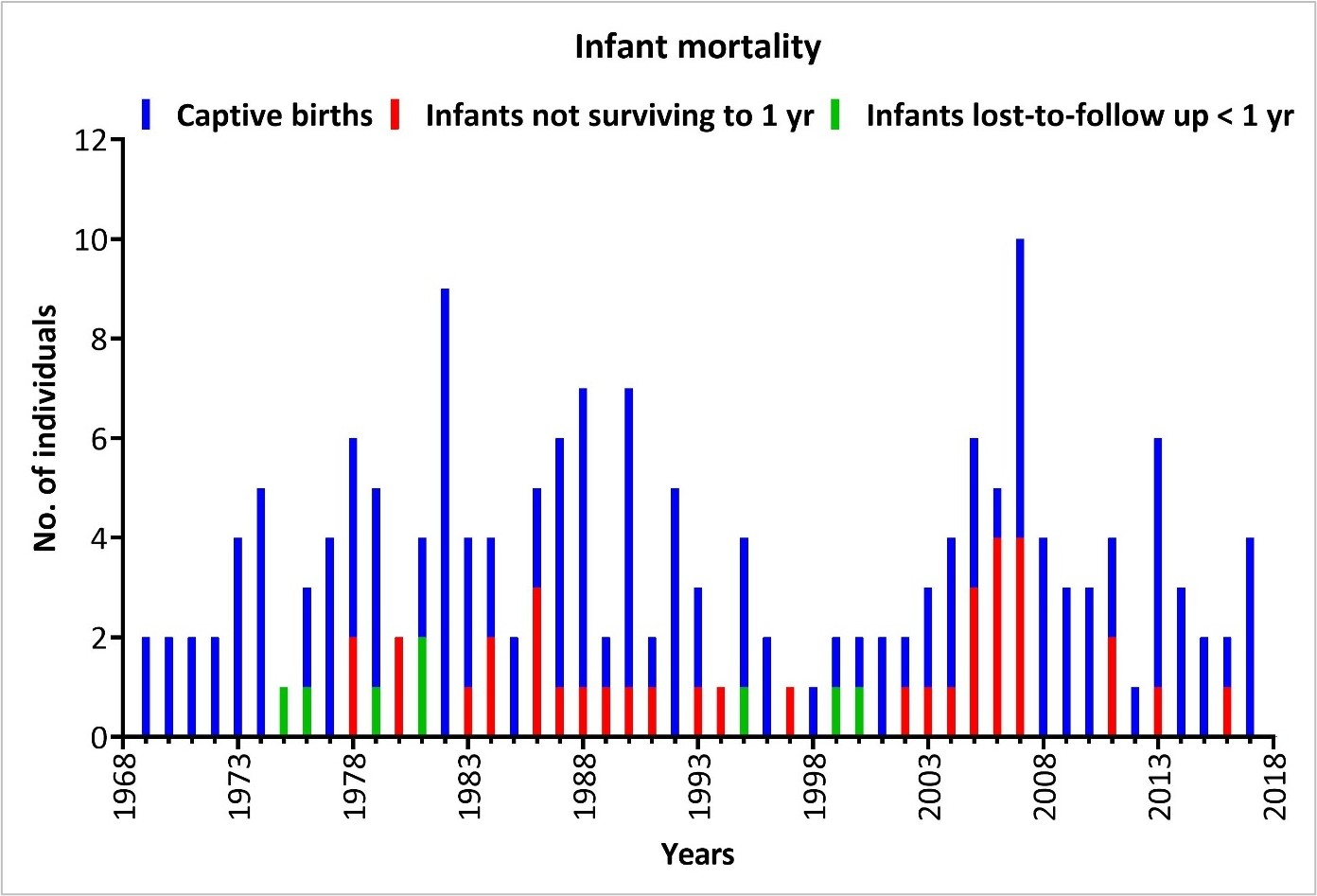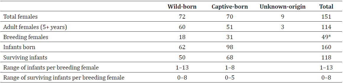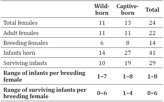 A total of 26% of the infants born to known mothers did not survive to the age of 1 year. Among the wild-born females, only 25% (n = 18) bred, contributing to 50 surviving infants.