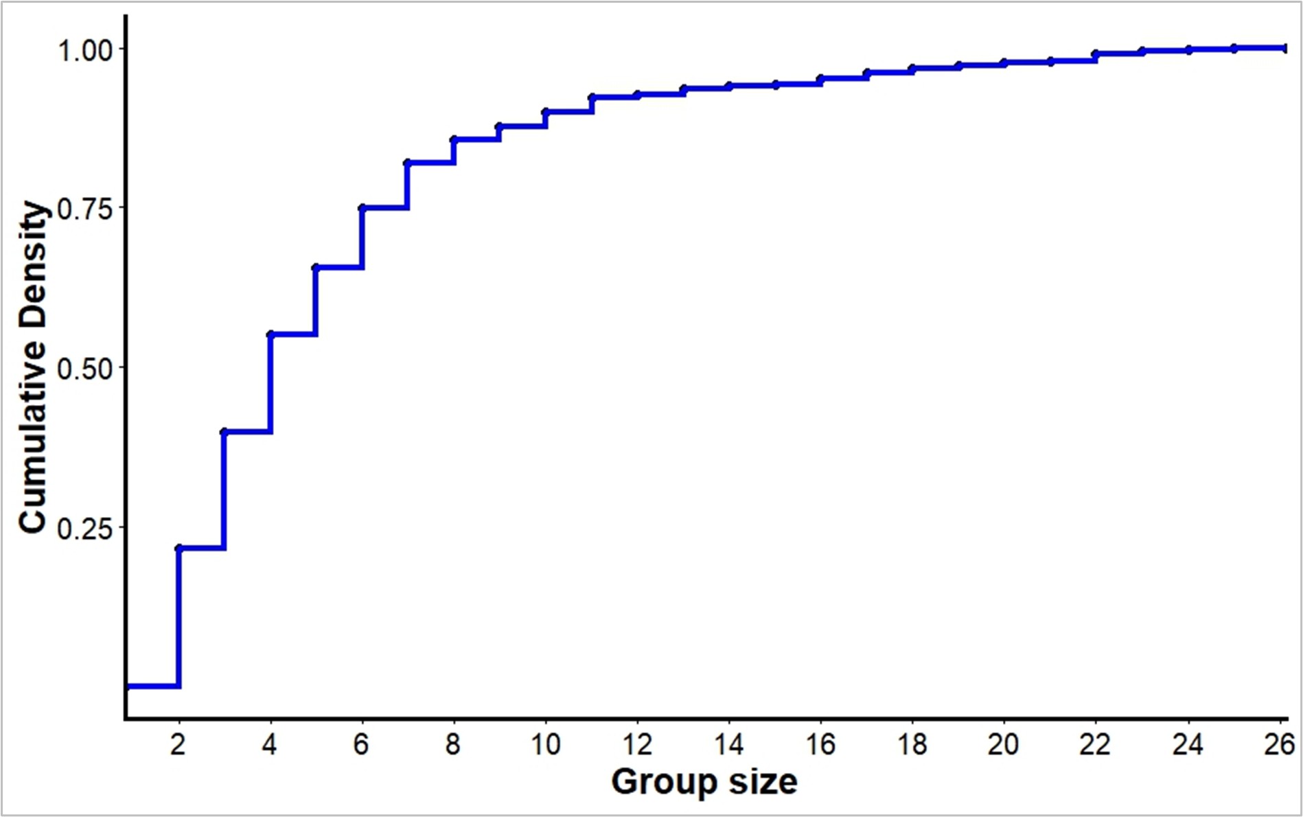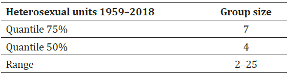 In order to describe and visualise the distribution of group sizes over the years, the empirical cumulative distribution function was applied. The analysis uses the number of individuals in heterosexual groups of two or more members, as recorded at the end of each year from 1959 to 2018. For the heterosexual groups, approximately 75% of the groups had fewer than seven members throughout the complete history of the population (Figure 8, Table 8).