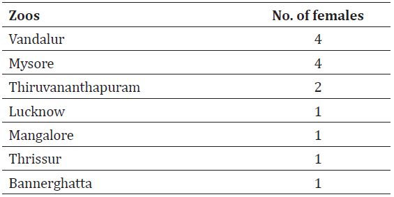 Seven zoos housed 14 females of breeding age (Table 10). Among the remaining three housing institutions, Delhi has a female under 5 years of age, who may breed in the future. Only two zoos have more than two females of breeding age. Furthermore, two zoos each house a single female of breeding age, and two other zoos maintain only pairs (see also Table 9).
