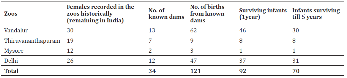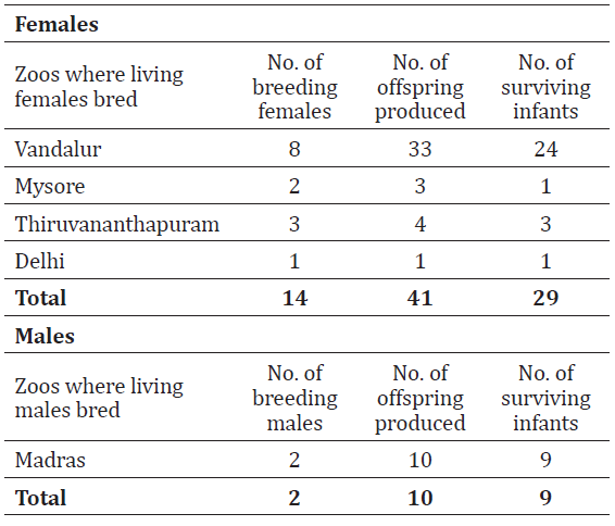 A total of 16 (2 males, 14 females) individuals in the living population as of 2018 bred in four institutions (Table 11). Females from only one zoo (Vandalur) contribute to approximately 83% of the surviving infants. Furthermore, there are no living sires in other zoos.