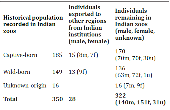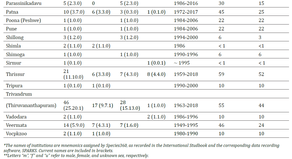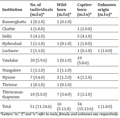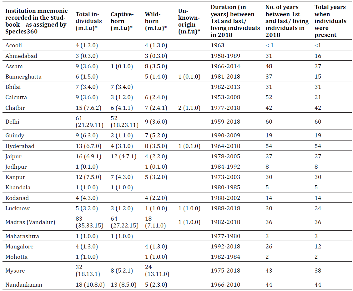Historically, a total of 350 individuals were recorded in 36 Indian institutions, as derived from the International Studbook (Table 2; Sliwa & Begum, 2019). Most institutions kept only a few individuals. The list includes 28 individuals who were transferred to other regions (see later).