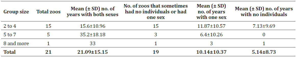 Most of the heterosexual units (n = 19) also experienced discontinuity and had periods during which either no individuals or only single-sex individuals were kept. Overall, most of these groups consisted of less than 5 members; keeping individuals in solitary conditions was, and is, not rare.