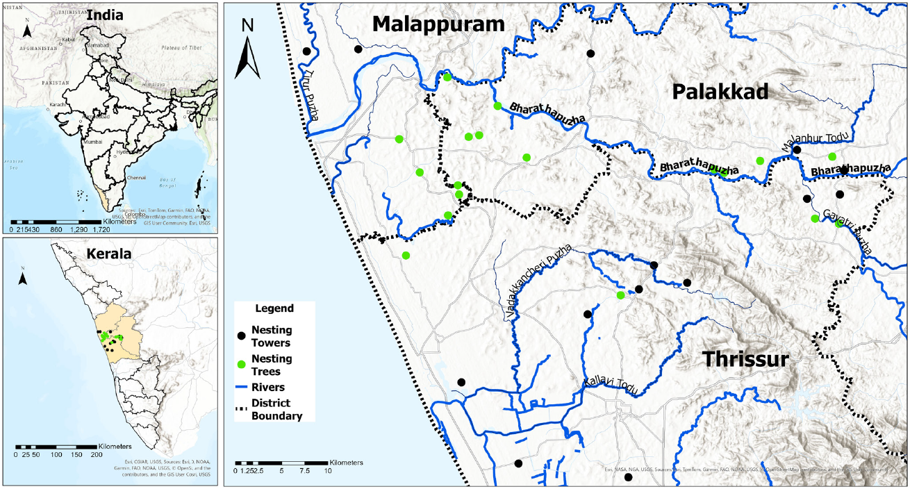 Nesting sites of C. episcopus in Kerala were identified through a combination of secondary data and systematic field surveys. Initial locations were compiled from published literature (Sashikumar et al., 2011; Greeshma et al., 2018; Roshnath & Greeshma, 2020), citizen science observations from eBird from 2014 to 2020 (www.ebird.org), having reports of confirmed breeding behavior, such as nest-building, occupied nests, and nests containing eggs or chicks. Field inspections were carried out to verify these reports and to assess the nesting status. Additional nesting records were gathered through outreach to local birdwatchers and appeals posted on birding forums and WhatsApp groups, and an inventory of known nesting sites was prepared.