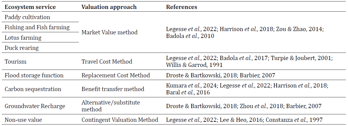 Despite their increasing ecological and economic significance, wetlands continue to degrade globally (Deane et al., 2017), with nearly 50% of wetland loss occurring since 1900—most notably in Asia (Hu et al., 2017). This widespread degradation has led to significant adverse impacts on ecosystem services,biodiversity, and human livelihoods (Costanza et al., 2014; Hu et al., 2017). Between 1997 and 2011 alone, global ecosystem services experienced an estimated annual loss of USD 4.3 trillion due to land-use changes (Costanza et al., 2014). Such persistent exploitation threatens the well-being of future generations and disproportionately affects vulnerable populations (De Groot et al., 2012). It is widely acknowledged that the true economic value of wetlands is frequently underestimated, as valuation efforts tend to emphasize tangible outputs such as agricultural and fishery resources, leading to systemic undervaluation (Turpie, 2010). Assigning economic value to ecosystem services offers a pathway to reframe societal interactions with natural systems (De Groot et al., 2012). Monetizing these services serves various policy and management functions, including the assessment of ecosystem restoration initiatives, the determination of access fees for protected areas, and the evaluation of conservation-related policy alternatives (Perez-Verdin et al., 2016). Robust valuation methodologies are also essential for informing biodiversity markets and supporting complex conservation decision-making processes (Engel et al., 2008).